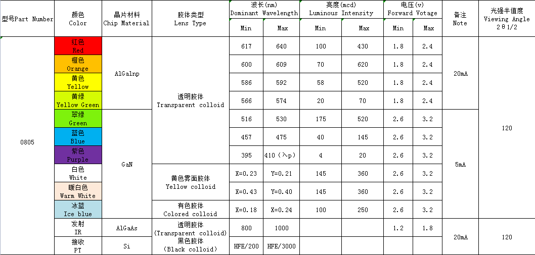 0805(單、雙、全彩、ICRGB發(fā)射接收)全系列